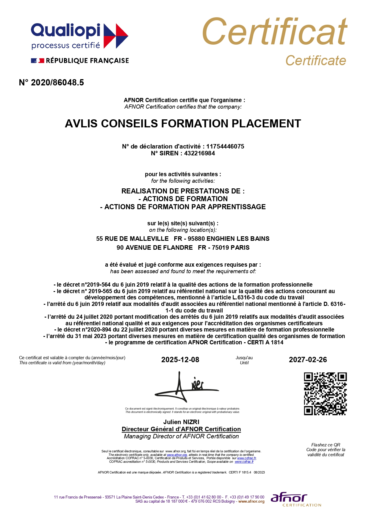 AVLIS Formation est en conformité avec l’ensemble des 32 indicateurs exigés par la certification QUALIOPI.